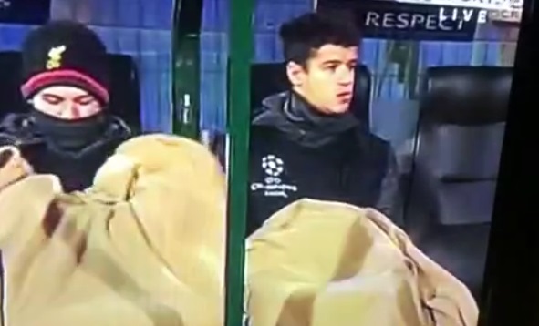 Le joueur de Liverpool, Philippe Coutinho, filmé sur le banc de touche en train de se réchauffer lors du match entre son équipe et celle de Ludogorets (Bulgarie) en Ligue des Champions (2-2).