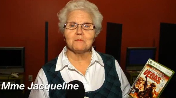 Bombe.tv a réussit à retrouver Mme Jacqueline, la grand-maman des pubs de Videotron. Elle était invitée chez Ubisoft pour essayer le jeu Rainbox Six Vegas 2 !