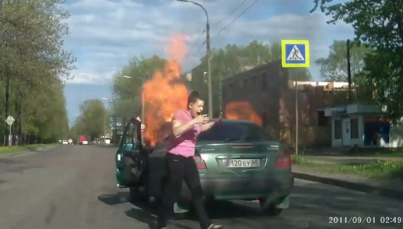 Une automobiliste russe a eu la très mauvaise idée d'allumer sa cigarette alors qu'elle transportait un jerrican d'essence sur le siège passager de sa voiture. https://www.youtube.com/watch?v=qVn...