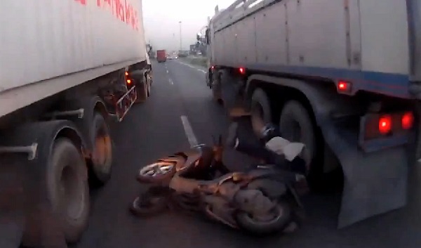 Ce n'est pas passé loin pour ce thaïlandais qui perd le contrôle de son scooter entre deux poids lourds.
