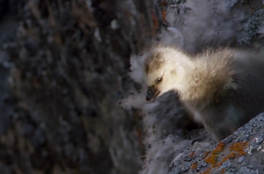 Cet oisillon (Bernache nonnette) va quitter son nid pour la première fois en effectuant un incroyable saut du haut d'une falaise !