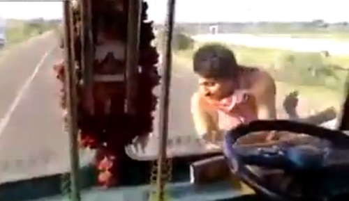 Un chauffeur indien risque sa vie "au volant" de son camion.