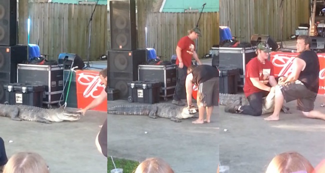 Plus de peur que de mal pour ce dompteur qui s'est fait mordre par un alligator durant une représentation au festival organisé à Old Town Spring au Texas, aux États-Unis, samedi dernier. Gary Sau...