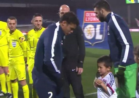 Très beau geste du défenseur brésilien du PSG Thiago Silva, qui a offert sa veste au petit garçon qui l'accompagnait sur la pelouse avant le choc OL-PSG (1-1-), dimanche, au stade de Gerland. ...