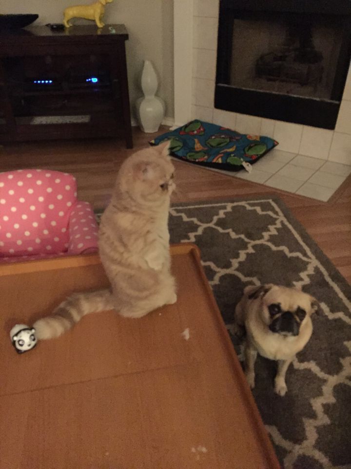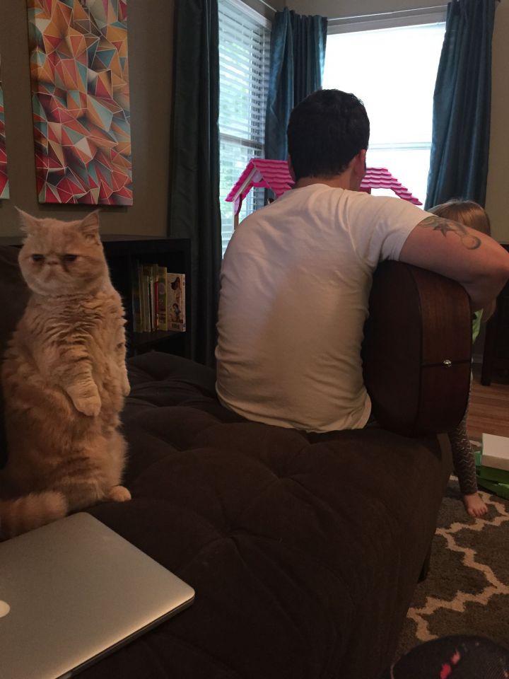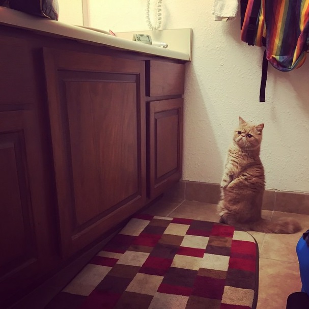 Son maître Enzo parle de cette particularité : « George a toujours fait ça. Il le fait simplement parce qu’il est bizarre. Il ne souffre pas, il n’a pas été dégriffé. C’est juste quelque chose qu’il fait. C’est le plus gentil de tous les chats. Très bizarre mais gentil. Cela est vraiment étrange de se réveiller et de le voir debout, en train de regarder directement dans votre âme depuis une autre pièce« .