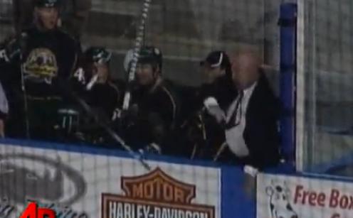 L’entraîneur de l’équipe de Louisiana IceGators en hockey sur glace, ne semble pas porter l’arbitre de la rencontre contre Pensacola dans son cœur.