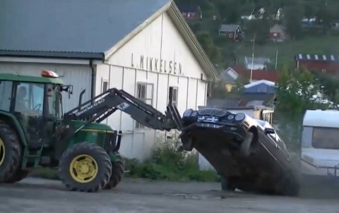 Norvège – Le voleur qui avait tenté de cambrioler une petite épicerie, a été « arrêté » par le propriétaire du commerce. Alors qu’il voulait prendre la fuite à bord de sa Mercedes, Harald Mikkelsen, a pris son tracteur et a percuté la voiture du voleur, avant de la soulever.