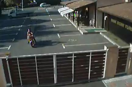 Ces images ont été enregistrées par les caméras de surveillance du parking d’un restaurant. On y voit un homme en moto qui se dirige droit vers le portail clos, bizarrement il ne freine pas.