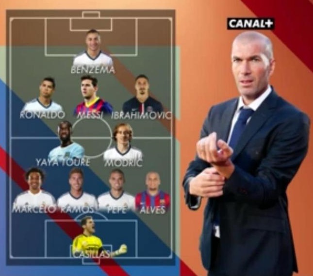 Le onze 2014 de Zidane : Casillas – Daniel Alves, Pepe, Ramos, Marcelo – Modric, Yaya Touré – Ibrahimovic, Messi, Ronaldo – Benzema. Remplaçants: Neuer, Lahm, Varane, Pogba, Iniesta, Ribéry, Agüero.