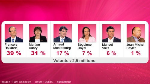 François Hollande est arrivé en tête de la primaire socialiste (39% des suffrages), devant Martine Aubry (31%), 3e Arnaud Montebourg (17%), 4e Ségolène Royal (7%), 5e Manuel Valls (6%) et 6 place pour Jean-Michel Baylet (1%).