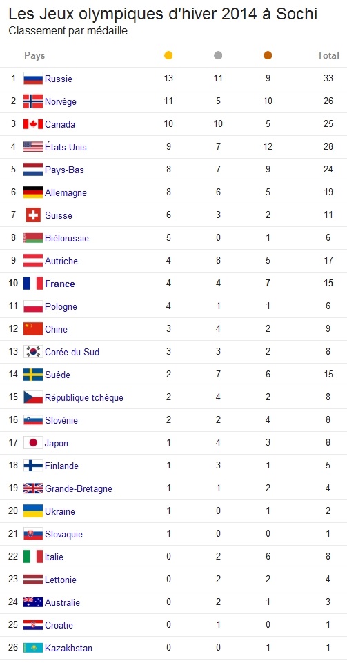 Découvrez le tableau des médailles final des Jeux Olympiques 2014 qui se sont achevés dimanche 23 février à Sotchi, en Russie.