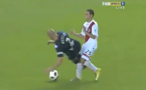 Tacle assassin du défenseur australien Kevin Muscat, lors du derby opposant son club du Melbourne Victory FC au Melbourne Heart.