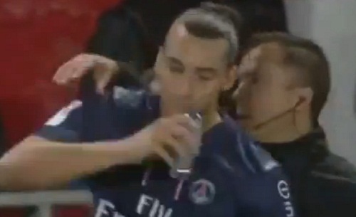 L'attaquant du PSG s'énerve contre le 4ème arbitre de la rencontre PSG-Troyes qui veut l'empêcher de boire. PSG 4-0 Troyes (2 buts et 2 passes décisives pour Ibrahimovic)