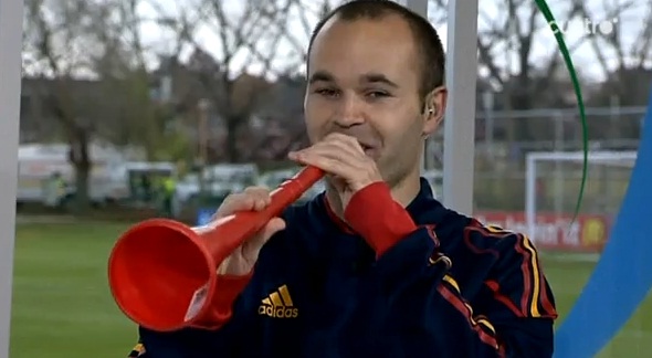 Le joueur espagnol Andrès Iniesta essaye la Vuvuzela, l'instrument qui provoque un vacarme assourdissant et qui donne mal au crâne à tous ceux qui se trouvent dans le stade... ou derrière leur télév...