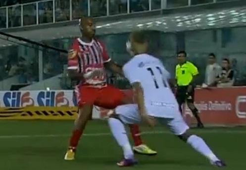 Humilié et irrité par les dribbles de Neymar, le défenseur de São Paulo est obligé de commettre une grosse faute pour arrêter le petit prodige ! Neymar auteur dimanche d'un hat-trick lors du mat...