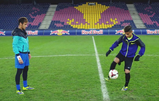 Défi : Pour les besoins d'une pub pour Red BUll, le joueur du Barça Neymar (21 ans) affronte le jeune espoir du Milan AC, Hachim Mastour (15 ans).
