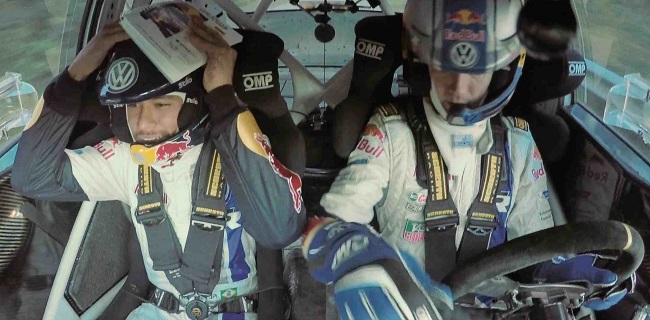 Le joueur du FC Barcelone Neymar, s'essaye au métier de co-pilote, aux côtés du double champion du monde des rallyes Sebastien Ogier. >