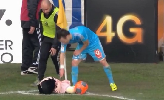 Alors qu’il s’apprêtait à tirer un corner, un spectateur lui a jeté une poupée de Betty Boop ! Sochaux-OM (1-1), samedi, 29 mars 2014