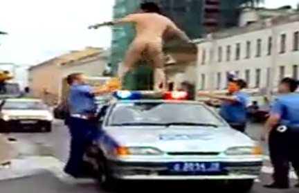 Un russe (pour ne je sais quelle raison) monte sur le toit d'une voiture de police devant ses occupants. Un des policier comment à en avoir marre, il le fait revenir à la réalité très violemment ....