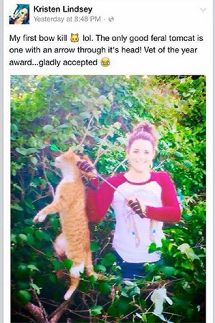 La photo était accompagnée d’une légende disant « Premier tué avec l’arc lol. Le seul bon matou sauvage, c’est celui avec une flèche dans la tête! Vétérinaire de l’année… J’accepte volontiers. »