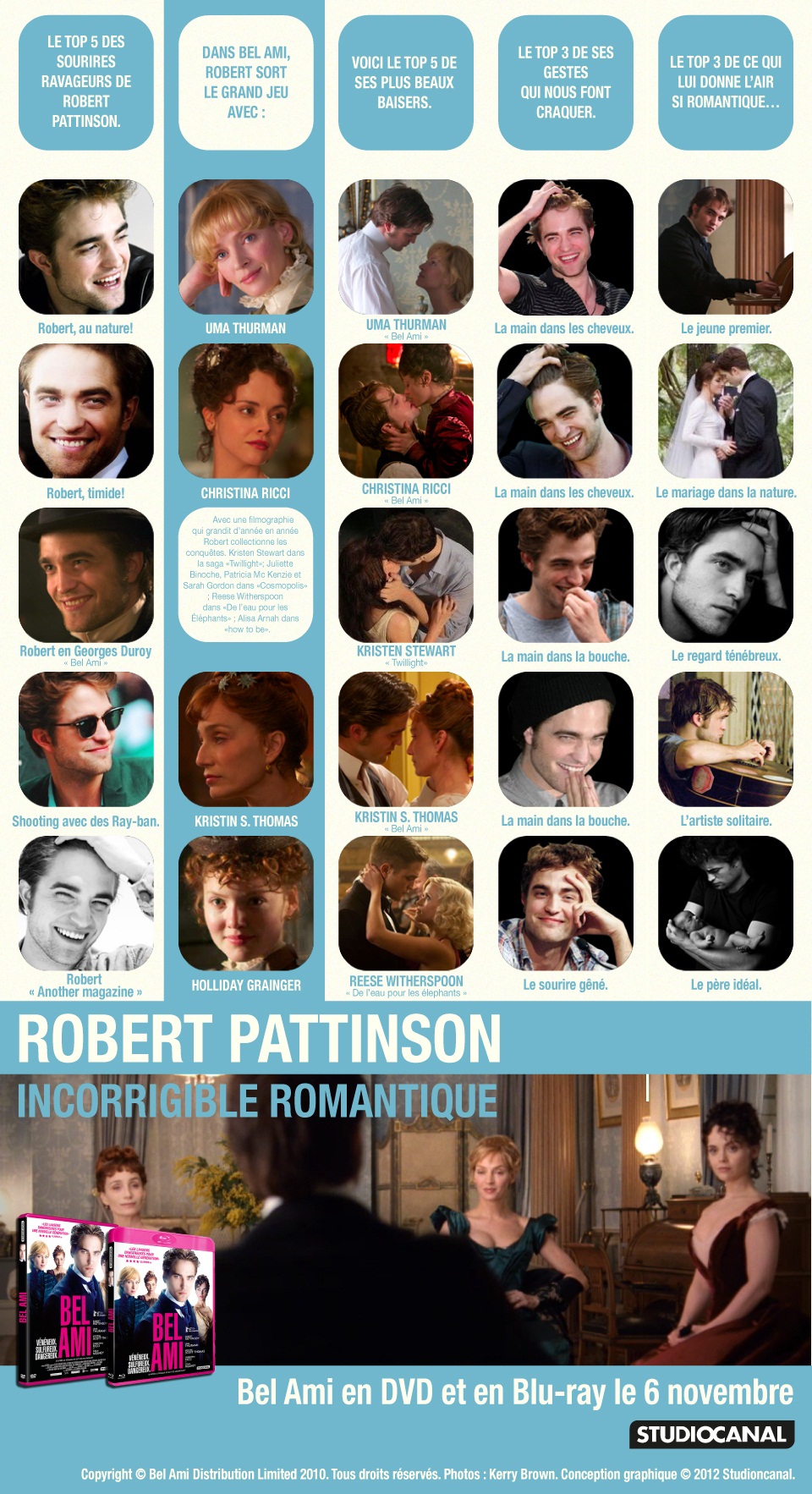 Sortie DVD et Blu-ray de Bel Ami (le 6 nov), film de Declan Donnellan, Nick Ormerod avec Uma Thurman, Kristin Scott Thomas, Christina Ricci et Robert Pattinson. Vidéo inédite tirée des bonus et une infographie de Robert Pattinson et ses côtés romantiques.