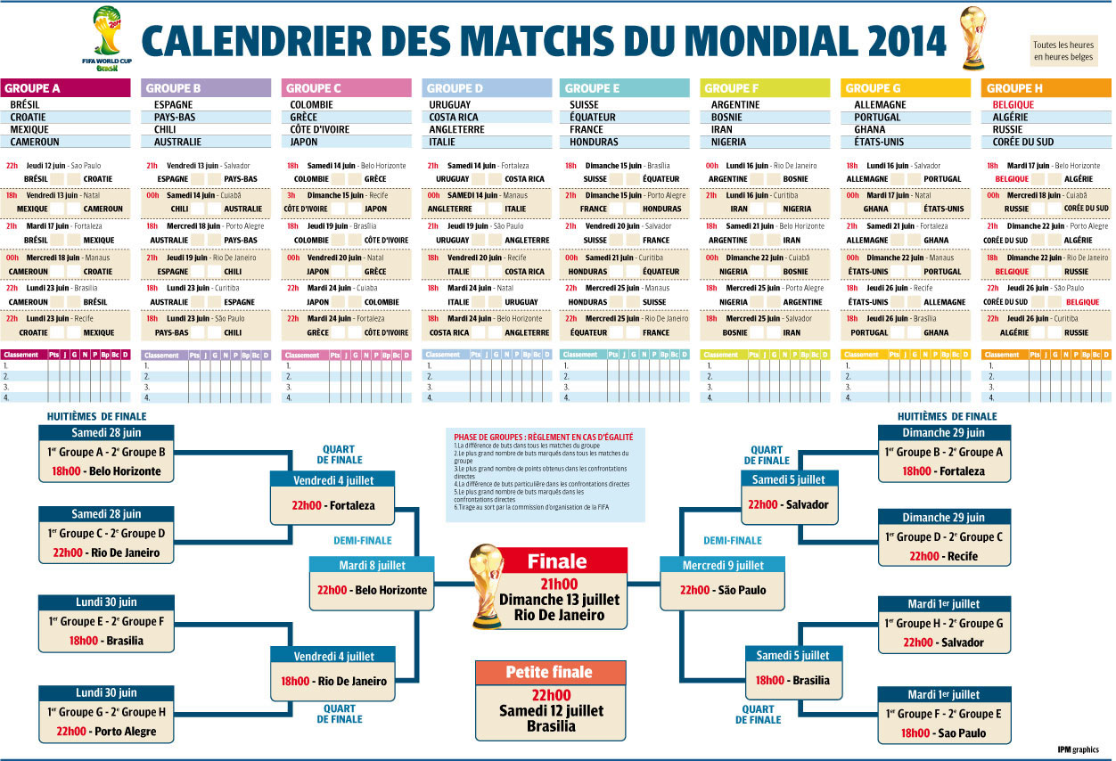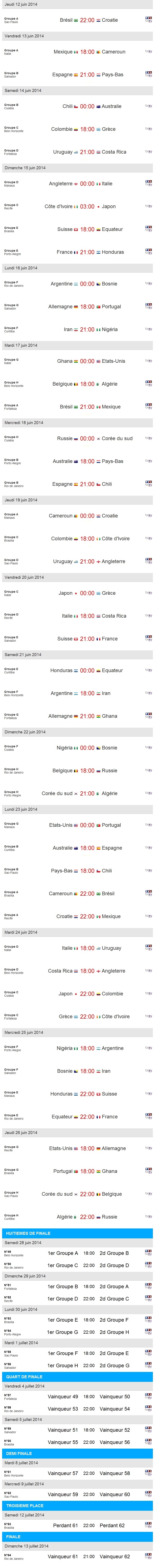 Découvrez et téléchargez le calendrier complet (dates + chaînes TV) de toutes les rencontres de la Coupe du Monde de Football, qui débutera le 12 juin prochain, au brésil. Allez les BLEUS !!!
