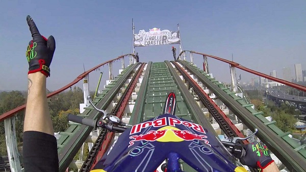 Julien Dupont, légende française du trial, dévale les pentes d'une montagne russe d'un parc d'attractions mexicain pour Red Bull.