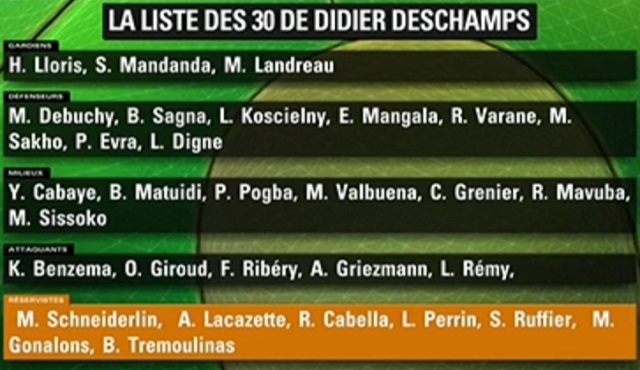 Le sélectionneur des Bleus Didier Deschamps a dévoilé une liste de 23 joueurs qui représenteront la France lors de la Coupe du Monde 2014 au Brésil et une autre comprenant les noms de 7 réservistes.