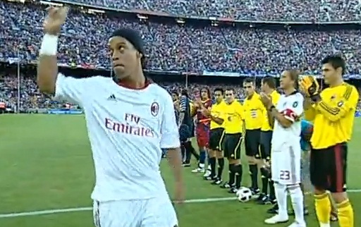 L’occasion pour le club blaugrana de lui rendre un vibrant hommage, dans un petit cérémonial précédant la rencontre. Partout où il passe, Ronaldinho est décidément un joueur qui ne s’oublie pas. source : sportweek.fr