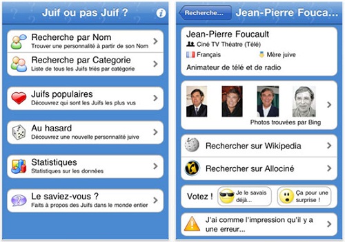 « Juif ou pas juif » pas très casher ? Pour 0,79€, cette application pour iPhone vous permet de savoir si votre star préférée ou votre député est d’origine ou de confession juive. Un scandale pour les associations juives. Le concepteur de l’appli lui ne comprend pas la levée de boucliers.