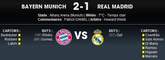Le Bayern arrache la victoire contre le Real Madrid (2-1) grâce à des buts signés Ribéry et Gomez. Match retour, la semaine prochaine à Madrid. En attendant, regardez les buts de la rencontre.