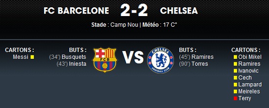 Demi-finale retour : Chelsea a décroché son billet pour la finale de la Ligue des Champions après son match nul face au FC Barcelone (2-2), mardi soir au Camp Nou.