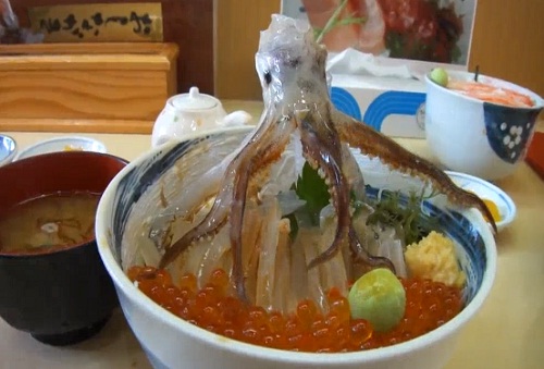 Le Odori-don (littéralement « bol de riz avec calamar dansant ») est un plat japonais très populaire dans la ville d’Hakodate. Un calamar sans tête, servi avec du riz collant sur lequel on verse de la sauce soja pour le faire danser !