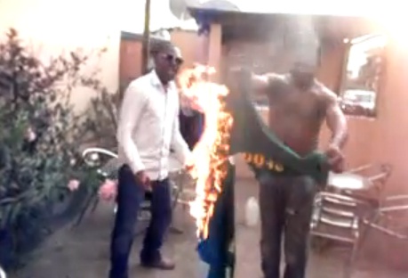 Très déçus par la performance de leur équipe nationale contre le Sénégal (0-0) dans les éliminatoires pour la CAN 2012, ces « supporters » Camerounais décident de brûler le maillot de Samuel Eto’o qui avait raté un penalty à la 90e minute.