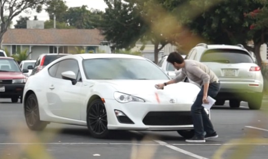 Un jeune homme utilise une fausse bombe de peinture pour tracer une ligne de séparation sur des voitures mal garées dans un parking. Regardez la réaction des propriétaires des véhicules "vandalisés". ...