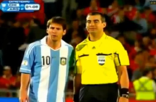 A la mi-temps du match de qualification pour le Mondial 2014 entre le Chili et l’Argentine (1-2), Nicolas Yegros, un des arbitres assistants demande à Messi de prendre la pose pour une petite photo so...