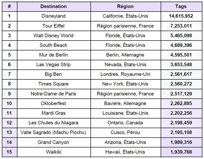 TravelBird, spécialiste du voyage en ligne, a publié “Les attractions touristiques les plus instagrammées, une étude qui classe 470 attractions à travers le monde en fonction du nombre de tags utilisés sur la célèbre plateforme de partage d’images.