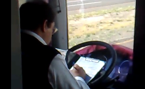Mexique – voici un chauffeur de bus polyvalent, mais inconscient. Il arrive à conduire et à prendre des notes en roulant. Un passager a filmé la scène et a posté la vidéo sur YouTube.